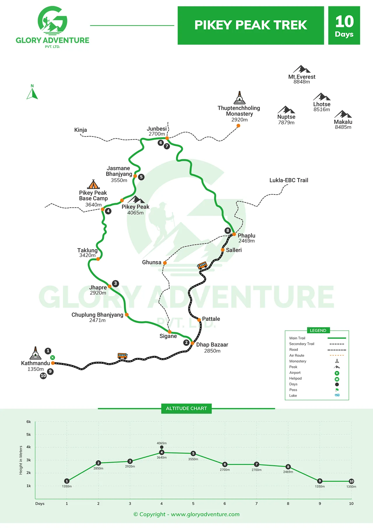 The 10-day Pikey Peak Trek itinerary is rated as a moderate trek in Nepal. However, the difficulty of trekking in Nepal is determined by several factors, including prior experience, fitness level, weather conditions, and the individual’s health. The route involves some steep uphill and downhill sections, as well as long trekking hours.